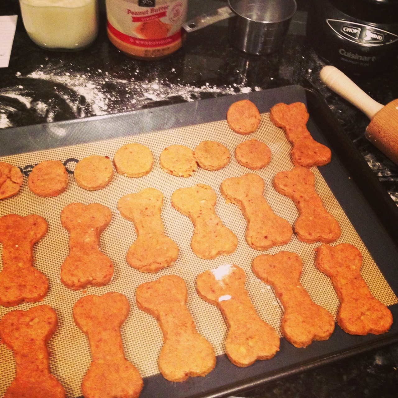 Blend the peanut butter and the milk in a mixer until smooth.  Add the other ingredients and process until the mixture is a sticky ball.  Roll out on a countertop, cut out shapes, and bake 30 minutes at 375C. For a crunchier treat, leave the treats in the oven 15-25 minutes extra after turning off the heat.  Allow to cool and store.